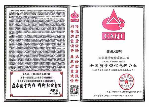 公司堅持以質(zhì)量為生命,以滿足用戶需求作為自己的追求,依靠雄厚的技術(shù)力量和先進的生產(chǎn)、檢測設(shè)備,對生鐵、球墨鑄鐵管產(chǎn)品進行全過程控制,產(chǎn)品質(zhì)量得到全面的保證